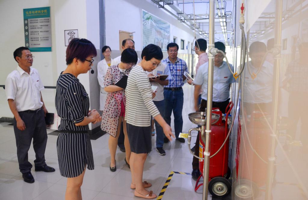 检查组认真细致地查阅了相关支撑材料,并在谢向东副校长,信实中心、保卫处等负责人陪同下,实地检查了化学与材料学院实验室、危化品仓库、生命科学学院实验室、信息与机电工程学院实验室、数理学院实验室、机械工程训练中心、信实中心网络机房等。