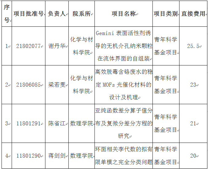 8月16日,国家自然科学基金委正式公布了2018年度国家自然科学基金申请项目评审结果,我校共获批国家自然科学基金项目4项,获批直接经费共计89.5万元,再创历史新高。获批项目数在全国位列857名,在省内同类高校中名列前茅。