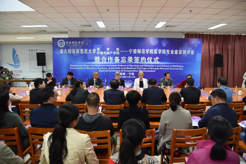 11月17日下午,我校医学院与澳大利亚西悉尼大学医学院、护理与助产学院专业建设研讨会暨合作备忘录签约仪式在东侨校区图书馆一层阅览室举行。校长魏远竹、副校长谢向东、陈旺玉,宁德市外侨办主任林岩峰,宁德市卫计委主任李惠长,澳大利亚西悉尼大学医学院院长安妮玛丽·亨内斯教授、护理与助产学院院长黛博拉·海切尔教授、心胸外科博士林文灯,福建省人民医院原院长孙朗清,以及医学院有关领导教师,宁德市各医院领导、业务科室负责人等50多人参加研讨会。陈旺玉主持会议。