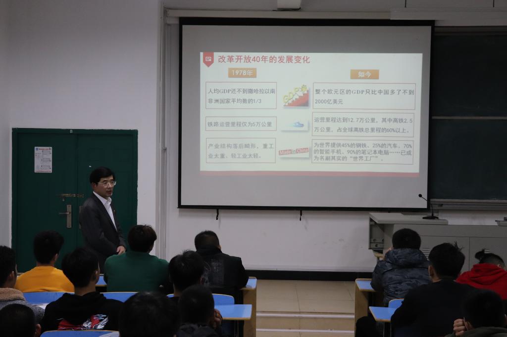 校领导全面回顾了改革开放的历史背景和40年来的发展变化,系统梳理了改革开放40年的光辉历程,深刻总结了改革开放以来我国取得的伟大成就和宝贵经验。通过引用大量数据、视频资料、详实案例,生动展示了改革开放四十年来中国从封闭型经济弱国到开放型全球经济大国、从贫穷到温饱再到整体小康、从世界舞台边缘日益走近世界舞台中央的发展历程,强调了改革开放是实现中华民族伟大复兴的必由之路,是决定当代中国命运实现“两个百年”目标和中国民族伟大复兴的关键一招,要求同学们要深刻感悟中国共产党人的初心与使命,紧跟时代步伐,牢牢把握党的思想,坚持改革开放的伟大路线,不断提高自身政治素养与思想觉悟,为实现中华民族伟大复兴的中国梦而努力奋斗。